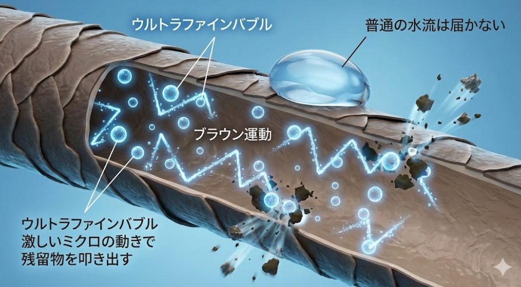 ◎ 2000回転/秒の渦で強力に引き剥がし | △ 水圧頼りの洗浄 | × ただ泡を流すだけ | ○ 一定の回転はある | × 物理的な力は弱い |