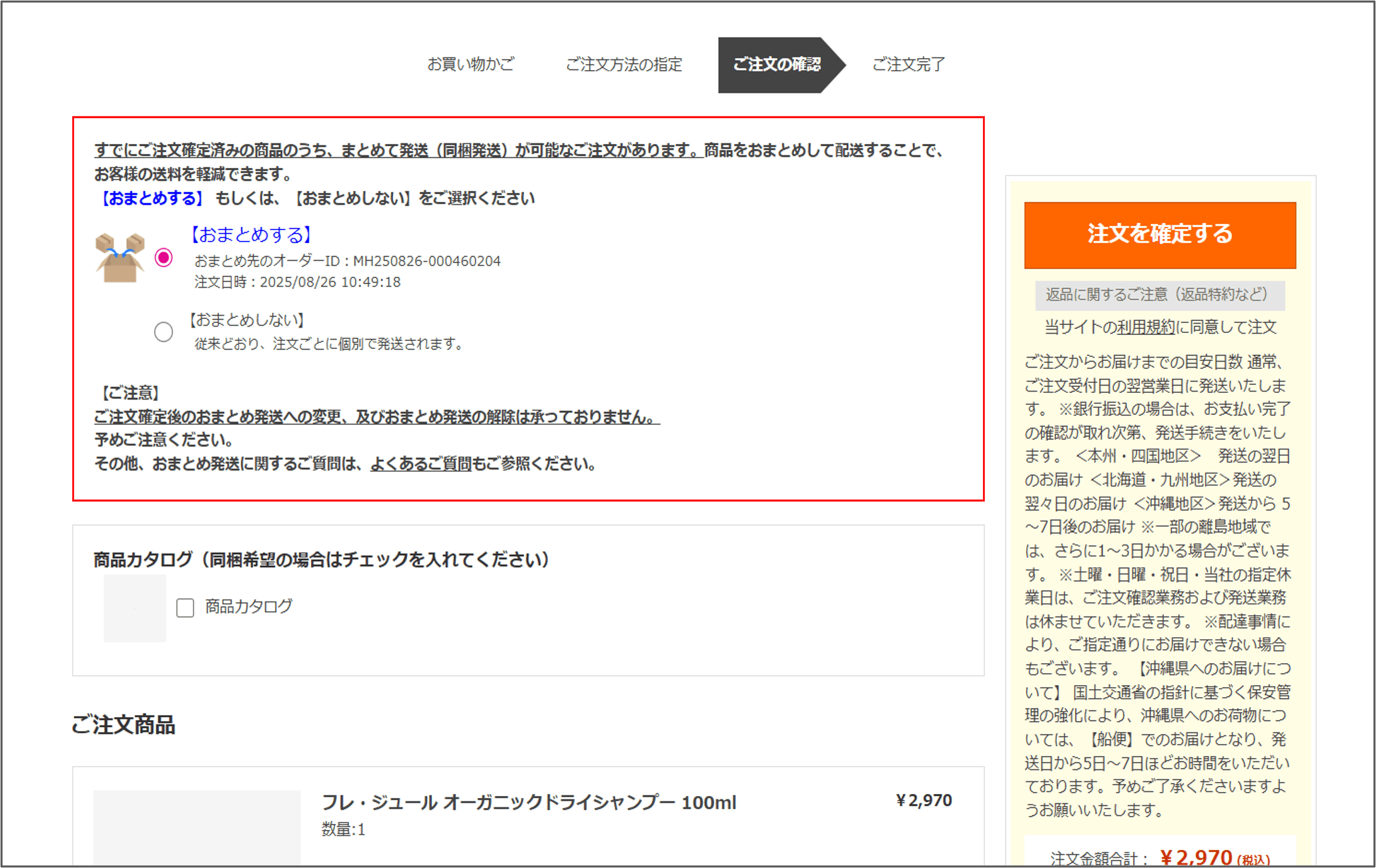 おまとめ(同梱)が可能な場合、2回目以降のご注文時、注文確認(最終)画面に下記のように、おまとめ(同梱)のご案内とともに選択ボタンが表示されます。